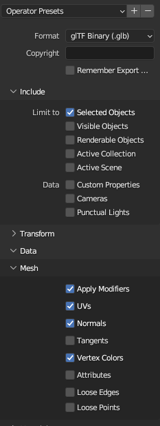 To export select the models you want to be contained on the .glb file then go to File - Export - glTF 2.0